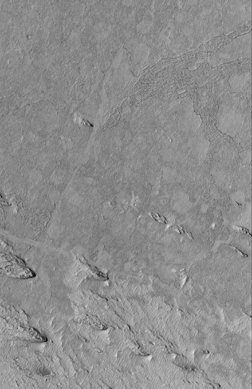 This Mars Global Surveyor (MGS) Mars Orbiter Camera (MOC) image shows exhumation of flow surfaces from beneath a material that was eroded by wind in the Cerberus/Zephyria region. The origin of the flow material has been a subject of debate among Mars scientists; it may have been very fluid lava or mud flows. In either case the material was buried for some time.