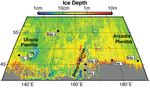 The map covers an area from 40 to 60 degrees north latitude and from 130 to 190 degrees east longitude. Estimates of the depth to water-ice come from a computer model and observations of the brightness and temperature of the surface. The model matches the ice-exposing crater observations by NASA's Mars Reconnaissance Orbiter and data from the neutron spectrometer on NASA's Mars Odyssey orbiter.
