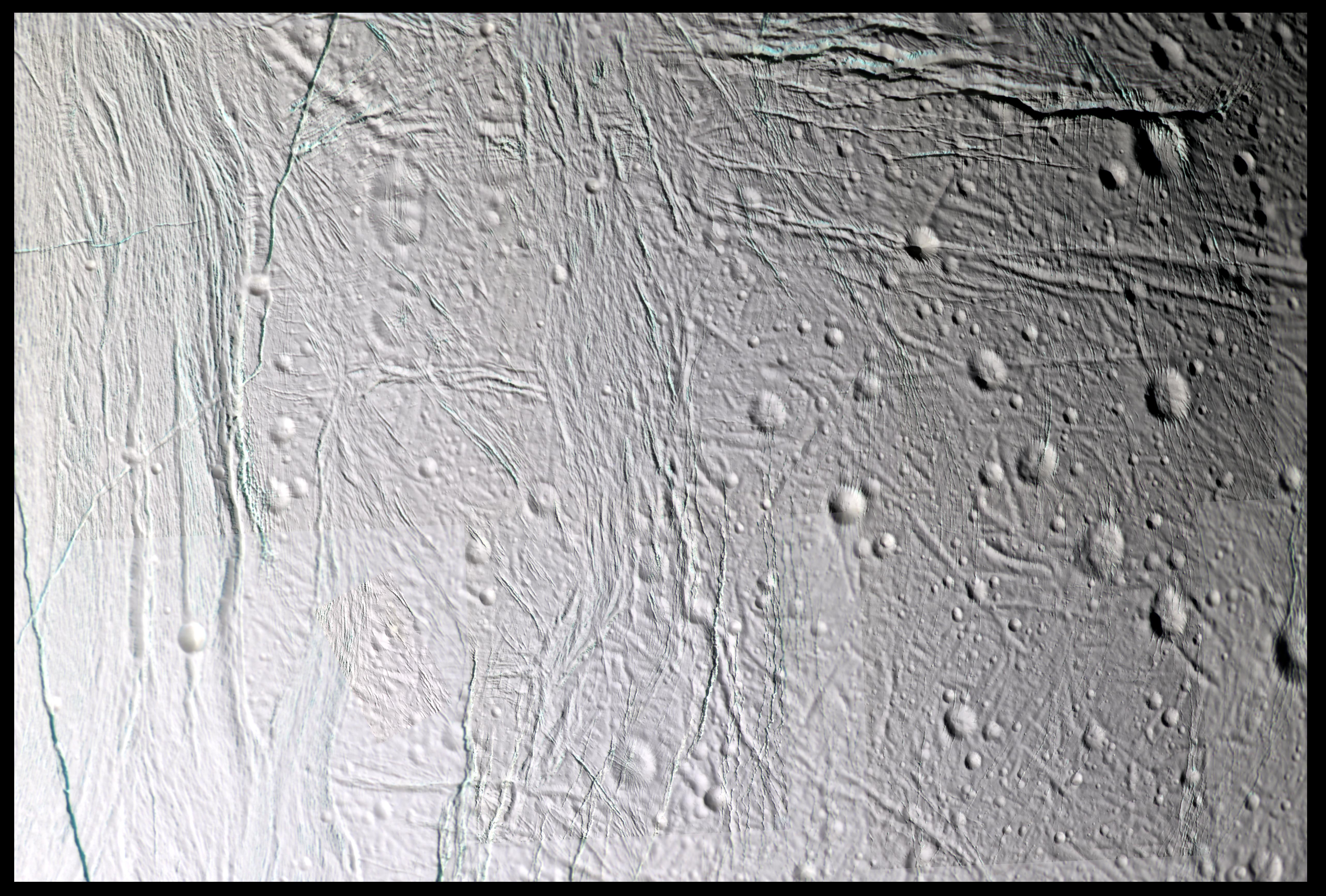 Many of the younger fractures have blue-green walls, revealing coarse-grained water ice in the top layers of Enceladus' lithosphere, compared to the fine-grained ice that coats much of Enceladus' surface. The blue-green color is very similar to the coatings of the south polar "tiger stripes." The color here is greener than the features in the south polar mosaic released in 2005 (see PIA07800) due to the use of clear-filter images, instead of green, in the latter mosaic.