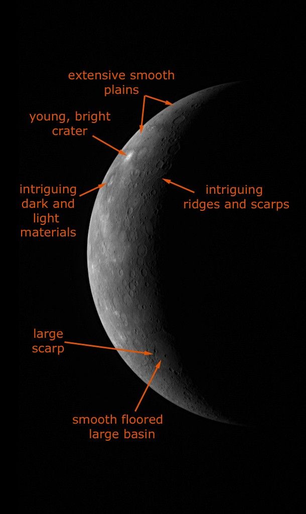 However, scientists on the team are already eagerly exploring the optical navigation images acquired just prior to the flyby. Shown here is a NAC image from the eighth and final optical navigation image set, taken about 14.5 hours before the flyby’s closest approach; Mercury appears as a thin sunlit crescent. Though much of Mercury is in darkness in this image, the visible portion had never been seen by spacecraft before. This portion of Mercury’s surface was not viewed during any of Mariner 10’s three flybys or during MESSENGER’s first flyby earlier this year. The newly imaged terrain shows a wide range of geologic features. Near the northern limb of the planet, extensive smooth plains, possibly volcanic in origin, are identified. A nearby crater is the brightest feature visible in the image, suggesting a relatively young age. This bright crater is consistent with a bright feature seen in Earth-based telescopic observations. In the southern region, a large basin is seen with a smooth floor, likely also a product of volcanism. A large scarp that appears to cut through this basin may have formed as Mercury cooled and contracted.