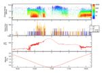 Plasma and magnetic field observations made during the near-Mercury parts of the orbit shown in Figure 3 in the Science Highlight article. The top panel shows proton plasma measurements from FIPS; the color scale denotes the total flux of these particles within a given interval of energy per charge. The second panel shows heavy ions within different ranges of mass per charge (m*), also measured by FIPS. The third panel shows MAG measurements of magnetic field strength. The bottom panel shows MESSENGER's altitude during passage near the planet, measured in units of Mercury's radius.
