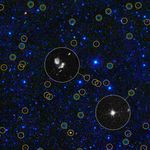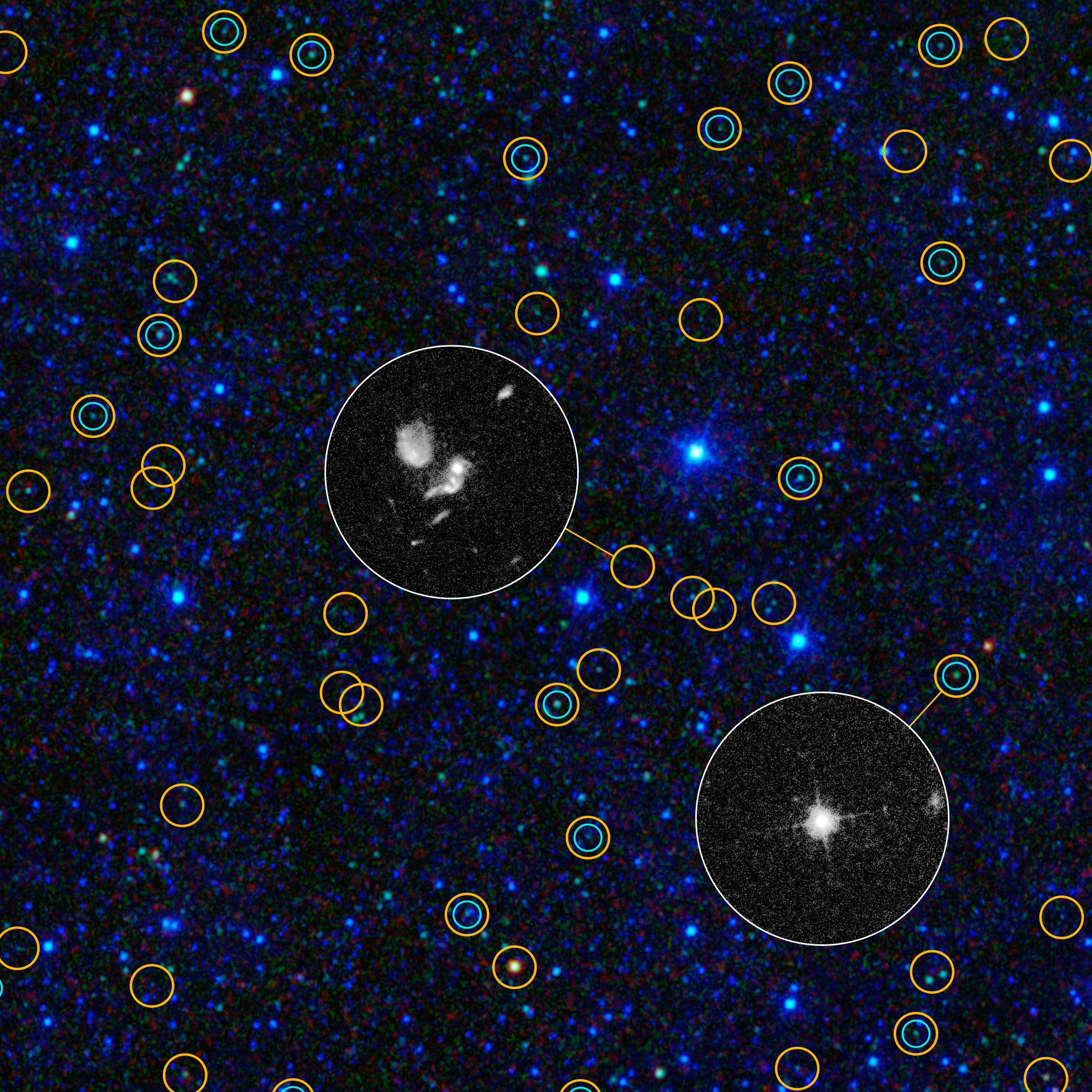 This zoomed-in view of a portion of the all-sky survey from NASA's Wide-field Infrared Survey Explorer shows a collection of quasar candidates. Quasars are supermassive black holes feeding off gas and dust. The larger yellow circles show WISE quasar candidates; the smaller blue-green circles show quasars found in the previous visible-light Sloan Digital Sky Survey. WISE finds three times as many quasar candidates with a comparable brightness. Thanks to WISE's infrared vision, it picks up previously known bright quasars as well as large numbers of hidden, dusty quasars.