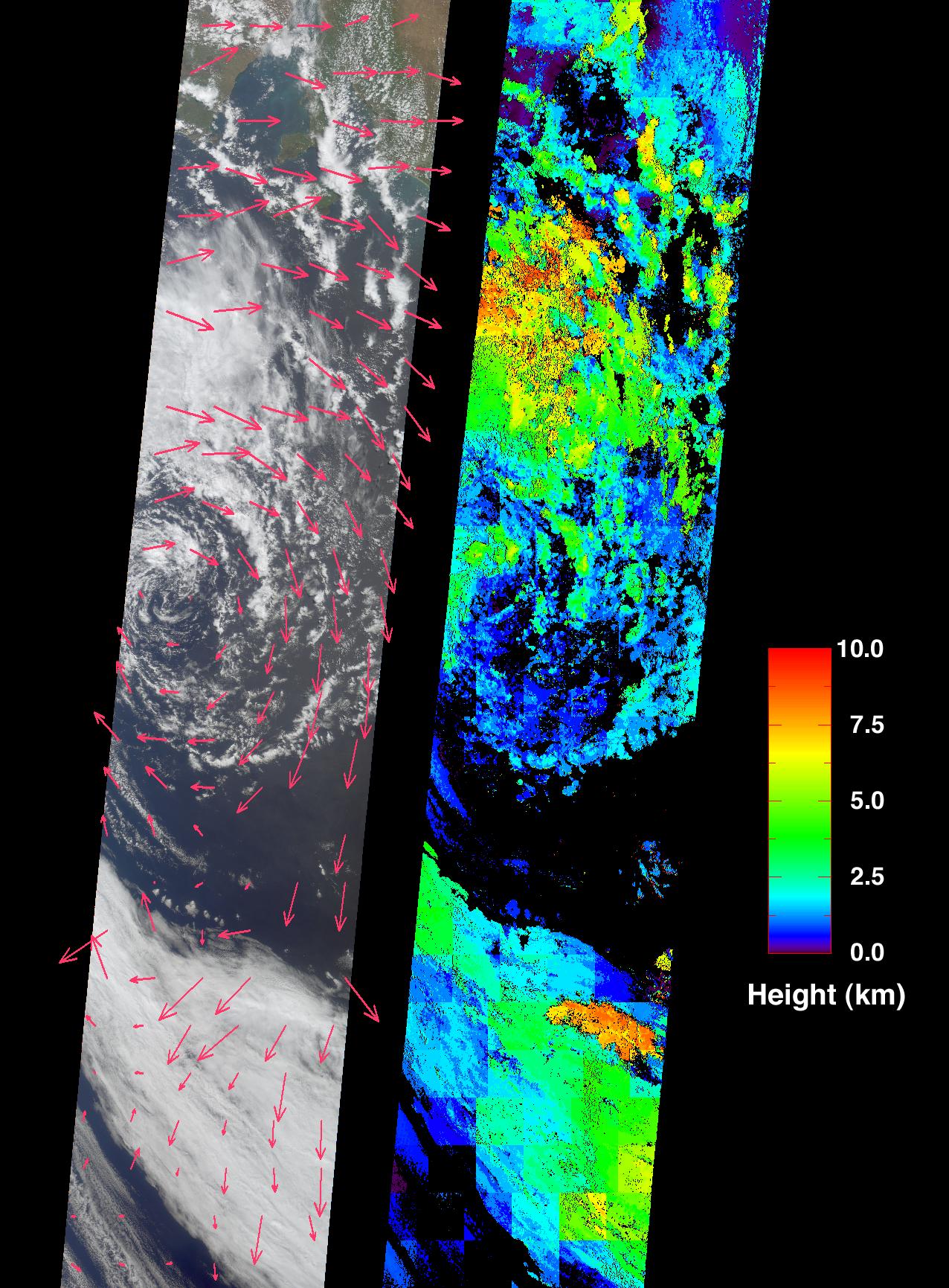 Parts of the Yorke Peninsula and a portion of the Murray-Darling River basin are visible between the clouds near the top of the left-hand image, a true-color view from MISR's nadir (vertical-viewing) camera. Retrieved cloud-tracked wind velocities are indicated by the superimposed arrows. The image on the right displays cloud-top heights. Areas where cloud heights could not be retrieved are shown in black. Both the wind vectors and the cloud heights were derived using data from multiple MISR cameras within automated computer processing algorithms. The stereoscopic algorithms used to generate these results are still being refined, and future versions of these products may show modest changes.