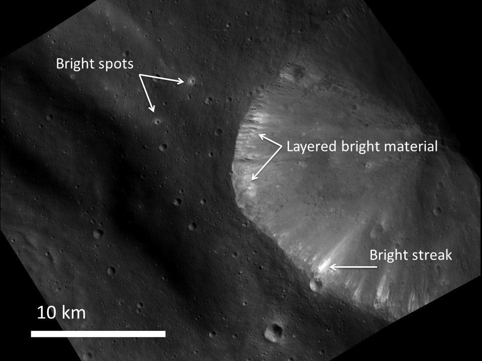 This image from NASA's Dawn spacecraft shows the brightest area seen on Vesta so far. It shows a crater located inside the rim of the Rheasilvia basin at the south pole of Vesta. The crater is on the edges of the Rheasilvia, Urbinia, and Pinaria quadrangles.