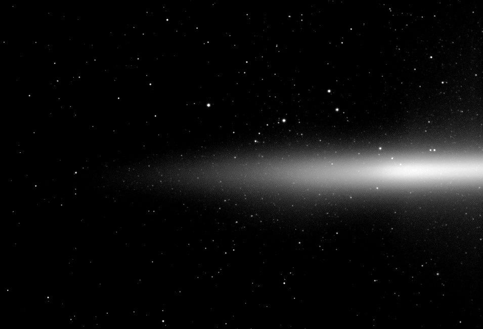 NASA's Cassini spacecraft takes a look at Saturn's diffuse E ring which is formed from icy material spewing out of the south pole of the moon Enceladus. The E ring is seen nearly edge-on from slightly above the northern side of Saturn's ring plane.