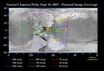 This map of the surface of Iapetus, generated from images taken by NASA's Cassini and Voyager spacecraft, illustrates the imaging coverage planned for Cassini's very close flyby of the two-toned moon on Sept. 10, 2007. This flyby will be Cassini's only close approach to Iapetus (1,468 kilometers, or 912 miles across) during the entire planned mission.