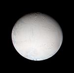 This false color view combines images obtained using filters sensitive to ultraviolet, polarized green and infrared light. The images were obtained with the Cassini spacecraft narrow angle camera on Feb. 16, 2005, at distances ranging from 179,727 to 179,601 kilometers (111,677 to 111,599 miles) from Enceladus and at a Sun-Enceladus-spacecraft, or phase, angle of 22 degrees. Resolution in the image is about 1 kilometer (0.6 mile) per pixel.