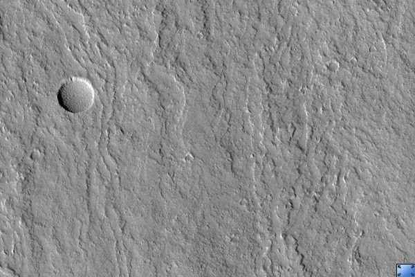 When viewed at full-resolution, the HiRISE image shows a fuzzy pitted surface. This is caused by a thick layer of very small particles that are being moved around by the wind. It is not clear at this point in time whether these particles are predominantly dust deposited from the global dust storms or if they are mostly volcanic ash.