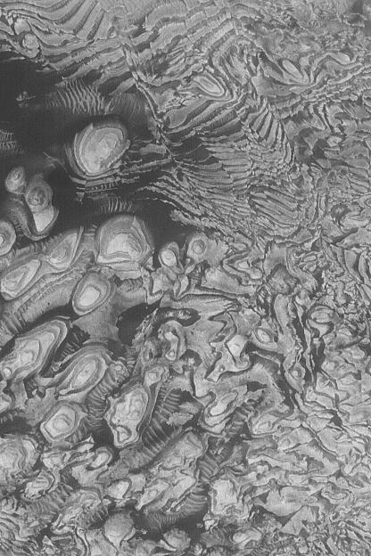 This Mars Global Surveyor (MGS) Mars Orbiter Camera (MOC) image shows some of the layered, sedimentary rock outcrops that occur in a crater located at 8°N, 7°W, in western Arabia Terra. Dark layers and dark sand have enhanced the contrast of this scene. In the upper half of the image, one can see numerous lines that off-set the layers. These lines are faults along which the rocks have broken and moved. The regularity of layer thickness and erosional expression are taken as evidence that the crater in which these rocks occur might once have been a lake. The image covers an area about 1.9 km (1.2 mi) wide. Sunlight illuminates the scene from the lower left.