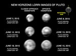 These images, taken by New Horizons' Long Range Reconnaissance Imager (LORRI), show numerous large-scale features on Pluto's surface. The distance to Pluto ranges from 47 million kilometers (about 29 million miles) on June 5 to 31 million kilometers (19 million miles) on June 18. When various large, dark and bright regions appear near limbs, they give Pluto a distinct, but false, non-spherical appearance. Pluto is known to be almost perfectly spherical from previous data. These images are displayed at four times the native LORRI image size, and have been processed using a method called deconvolution, which sharpens the original images to enhance features on Pluto.