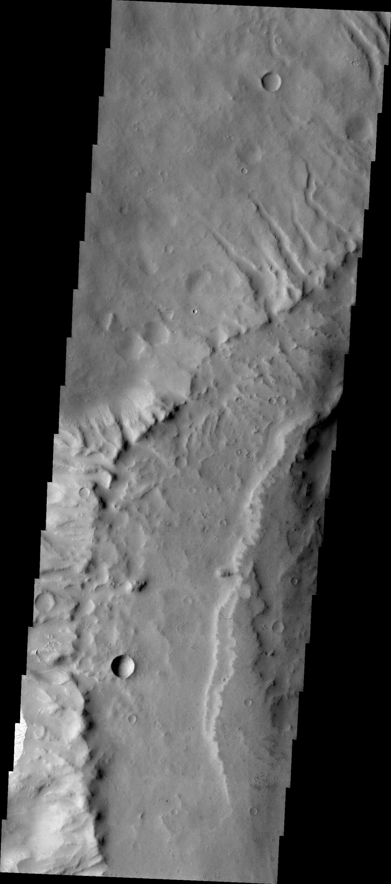 Note: this THEMIS visual image has not been radiometrically nor geometrically calibrated for this preliminary release. An empirical correction has been performed to remove instrumental effects. A linear shift has been applied in the cross-track and down-track direction to approximate spacecraft and planetary motion. Fully calibrated and geometrically projected images will be released through the Planetary Data System in accordance with Project policies at a later time.