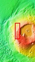The major Martian dust storm of 2007 filled the sky with dust and produced conditions that prevented the THEMIS VIS camera from being able to image the surface. With no new images being acquired, we've dug into the archive to highlight some interesting areas on Mars. The this week's region is Apollinaris Patera. Apollinaris Patera is an old volcano that has undergone extensive erosion. This volcano is located north of Gusev Crater, the home of the rover called Spirit. Today's image shows the northwestern edge of the summit caldera.