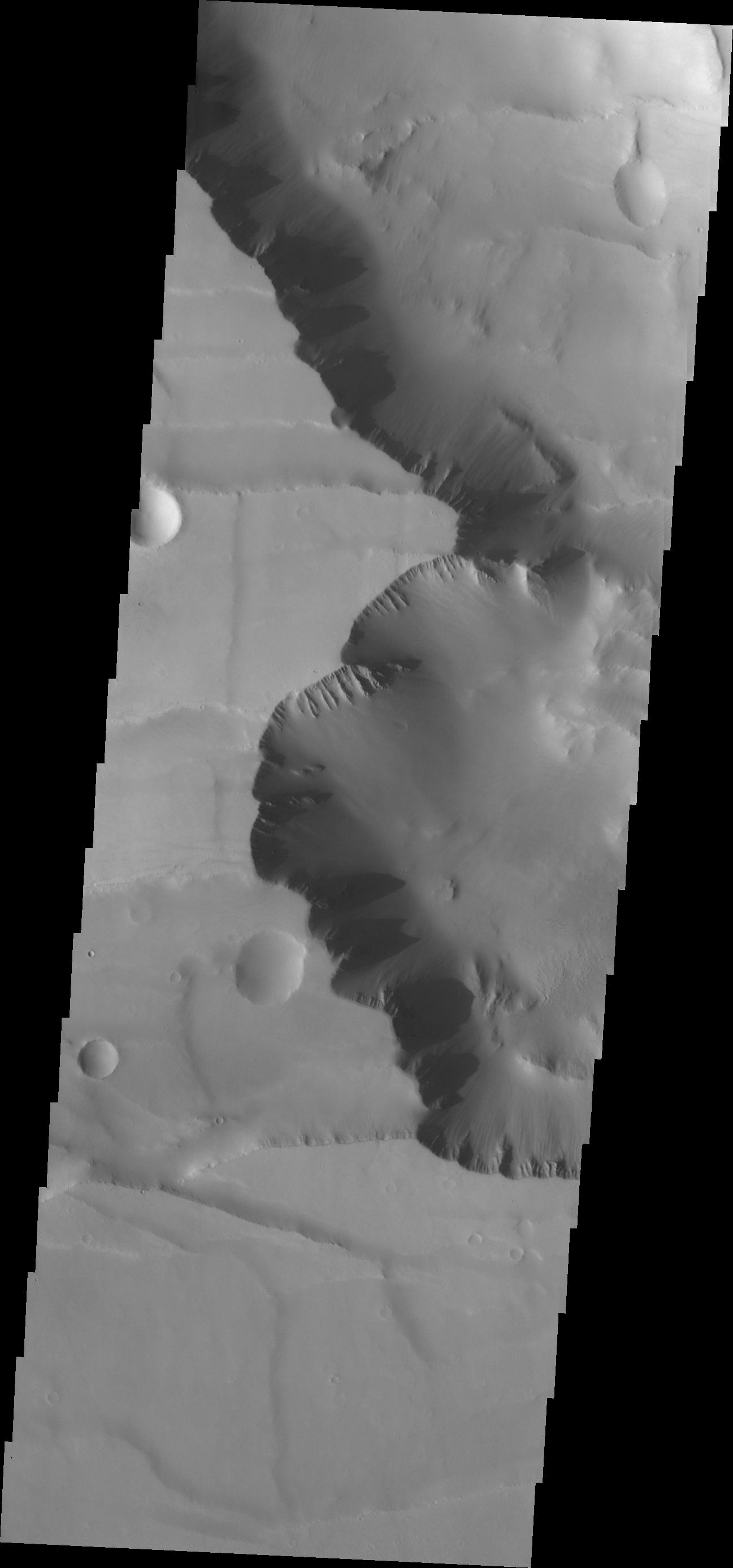 Note: this THEMIS visual image has not been radiometrically nor geometrically calibrated for this preliminary release. An empirical correction has been performed to remove instrumental effects. A linear shift has been applied in the cross-track and down-track direction to approximate spacecraft and planetary motion. Fully calibrated and geometrically projected images will be released through the Planetary Data System in accordance with Project policies at a later time.