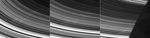 At the bottom left corner of the left and center images, the bright inner edge of the A ring is visible. Continuing radially inward (or toward Saturn) are several bands that lie within the Cassini Division, bounded by the bright outer edge of the B ring. The rounded shadow of Saturn cuts across the rings in the image at right.