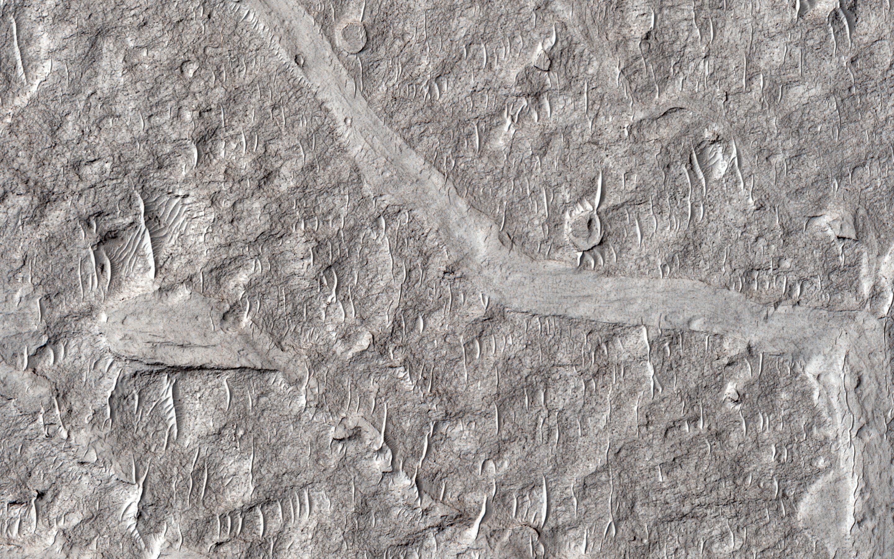 The raised relief of these branching ridges suggests that these are ancient channels are inverted due to lithification and cementation of the riverbed sediment, which made it more resistant to erosion than the surrounding material. Wind-blown bedforms are abundant and resemble small ridges that are aligned in an approximately north-south direction.