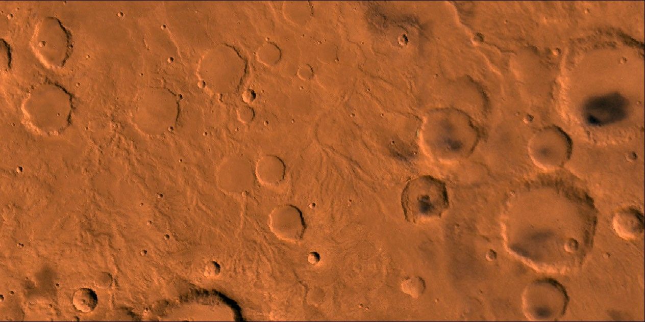 A color image of fine channel networks on Mars; north toward top. The scene shows heavily cratered highlands dissected by dendritic open channel networks that dissect steep slopes of impact crater walls.
