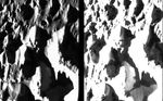 Dramatic view of fine details in ice hills and valleys in an unnamed region on Jupiter's moon Ganymede. North is to the top of the picture and the sun illuminates the surface from the left. The finest details that can be discerned in this picture are only 11 meters across (similar to the size of an average house) some 2000 times better than previous images of this region. The bright areas in the left hand version are the sides of hills facing the sun; the dark areas are shadows. In the right hand version the processing has been changed to bring out details in the shadowed regions that are illuminated by the bright hillsides. The brightness of some of the hillsides is so high that the picture elements "spill over" down the columns of the picture. The image was taken on June 28, 1996 from a distance of about 1000 kilometers. The Jet Propulsion Laboratory, Pasadena, CA manages the mission for NASA's Office of Space Science, Washington, DC. This image and other images and data received from Galileo are posted on the World Wide Web, on the Galileo mission home page at URL http://galileo.jpl.nasa.gov. Background information and educational context for the images can be found at http://www.jpl.nasa.gov/galileo/sepo.