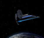 Artist's rendering of the proposed Fast Infrared Exoplanet Spectroscopy Survey Explorer - or FINESSE -- spacecraft orbiting above Earth.