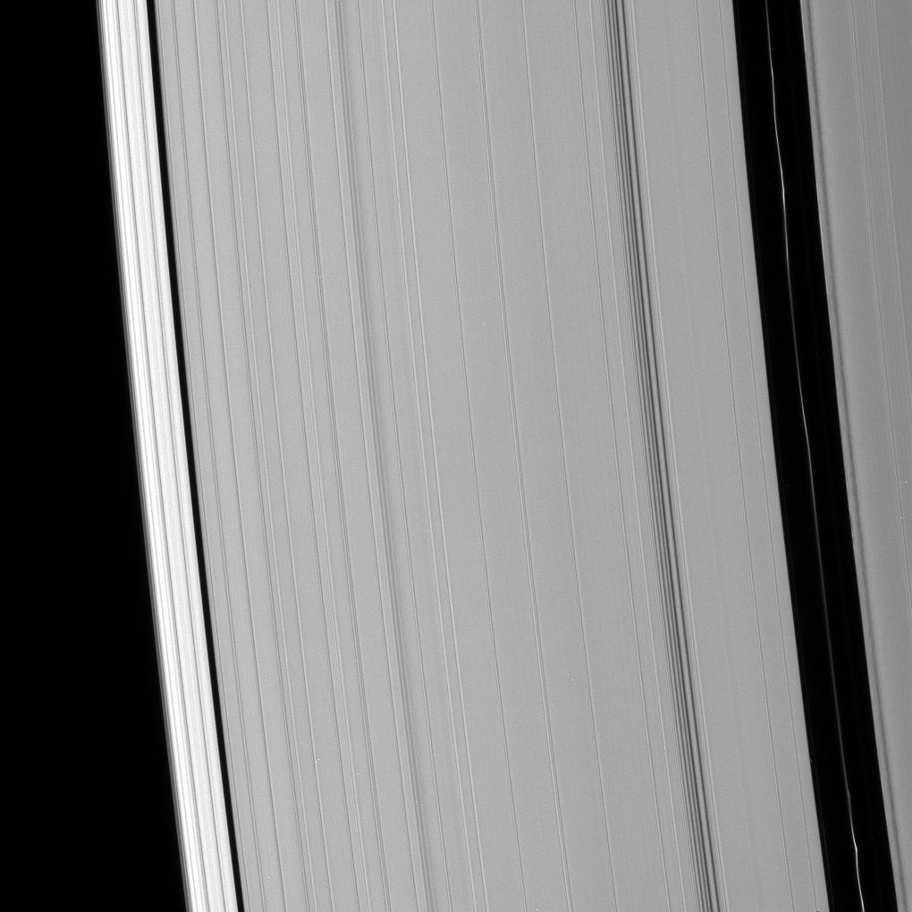 The Encke and Keeler gaps are visible in this image of the outer A ring. Brightness variations are clearly visible in the Encke ringlet.