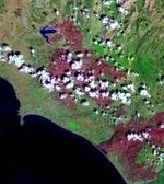 The last major fire in southern Greece was brought under control this weekend, but not until over 469,000 acres of mostly forest and farmland were destroyed. An estimated 4000 people lost their homes, and over 60 deaths were reported. These were the worst fires ever to occur in Greece. In this Advanced Spaceborne Thermal Emission and Reflection Radiometer (ASTER) image acquired September 4 over the western coast of the Peloponnesus Peninsula, burned areas appear in dark red, and unburned vegetation is green. The area includes the ancient site of Olympia, the site of the Olympic Games in classical times. The fires came within 2 kilometers (1.2 miles) of the archaeological site, but spared it.