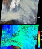 The lower panel provides a stereoscopically retrieved height field of the clouds and smoke plumes. The greenish areas indicate where smoke plumes extend several kilometers above a bank of patchy stratus clouds below. A few high clouds appear near the bottom of the image. Wind retrievals were excluded from this image in order to generate a smooth and continuous field. Although relative height variations are well-represented here, the inclusion of wind retrievals for this scene reduces the actual cloud height results by 1 to 2 kilometers. Areas where heights could not be retrieved are shown as dark gray.