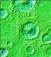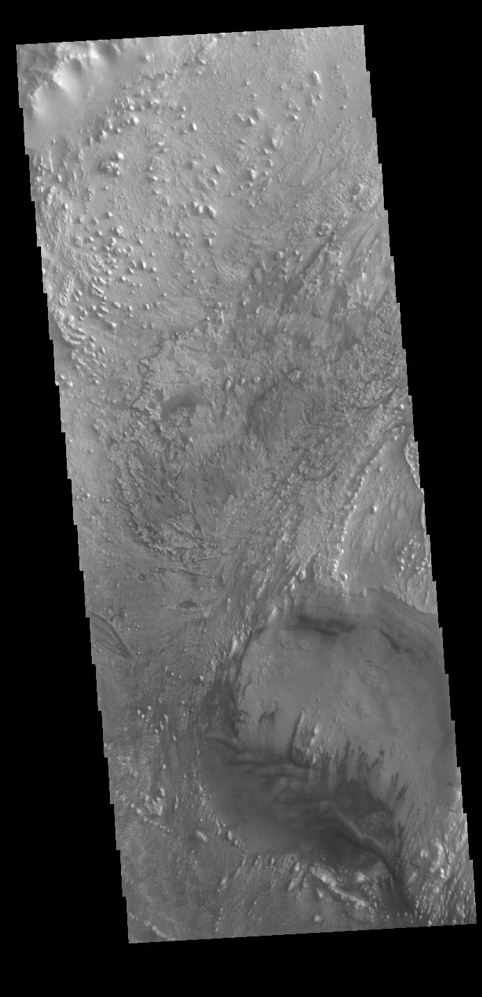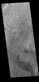 Today's VIS image shows part of the floor of Firsoff Crater. Located in Arabia Terra, Firsoff Crater, and the neighboring Crommelin Crater, contain large layered deposits on the crater floor. The north side of the smaller crater at the bottom of the image shows the layering. Wind action has modified the deposit. Firsoff Crater is 90 km in diameter (56 miles).