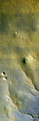 This is the first color image of Mars from the High Resolution Imaging Science Experiment on NASA's Mars Reconnaissance Orbiter. At the center portion of the camera's array of light detectors there are extra detectors to image in green and near-infrared color bandpasses, to be combined with the black-and-white images (from red-bandpass detectors) to create color images. This is not natural color as seen by human eyes, but infrared color -- shifted to longer wavelengths. This image also has been processed to enhance subtle color variations. The southern half of the scene is brighter and bluer than the northern half, perhaps due to early-morning fog in the atmosphere. Large-scale streaks in the northern half are due to the action of wind on surface materials. The blankets of material ejected from the many small fresh craters are generally brighter and redder than the surrounding surface, but a few are darker and less red. Two greenish spots in the middle right of the scene may have an unusual composition, and are good future targets for the Compact Reconnaissance Imaging Spectrometer for Mars, a mineral-identifying instrument on Mars Reconnaissance Orbiter (http://crism.jhuapl.edu/). In the bottom half of the image we see a redder color in the rough areas, where wind and sublimation of water or carbon dioxide ice have partially eroded patches of smooth-textured deposits.