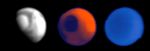 The 12-micron image (center) indicates that heat is being emitted from both the day side and the night side of the planet. The polar cap is dark in this image because it is cold (minus 190 degrees Fahrenheit) and emits less heat than surrounding areas. During the science phase of the mission, the thermal-infrared readings at this wavelength by Mars Climate Sounder will be used to track dust and clouds in the atmosphere. In the current season on Mars, the atmosphere is relatively clear except for an equatorial belt of thin water-ice clouds present in the visible-and-near-infrared image, and so the 12-micron image is dominated by the infrared radiation from the surface on the relatively hot dayside (upper right).
