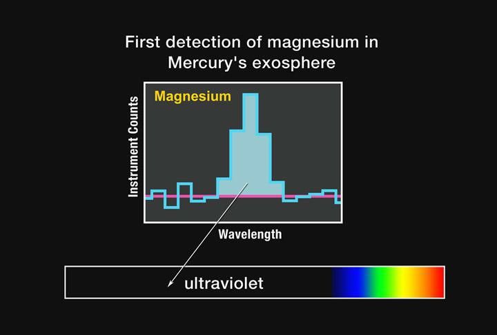 The histogram in this figure represents a typical MASCS observation in the tail region of Mercury’s exosphere from magnesium atoms. These MASCS measurements mark the first time that magnesium has been detected in Mercury’s exosphere. In contrast to emissions from sodium and calcium (see PIA11402), magnesium emission occurs at a wavelength that is in the ultraviolet part of the spectrum. Magnesium has not been observed from ground-based telescopes partly because it emits at ultraviolet wavelengths, which are completely obscured by Earth’s atmosphere. Because these atoms primarily originate at the surface of Mercury, the detection of magnesium in the exosphere provides evidence that magnesium is a component of surface material, something that has been expected for years but until now had not been proven. As with calcium and sodium, the distribution of magnesium in Mercury’s exosphere is a result of the processes that release the magnesium atoms from the surface and can provide valuable clues to the relative importance of each process.