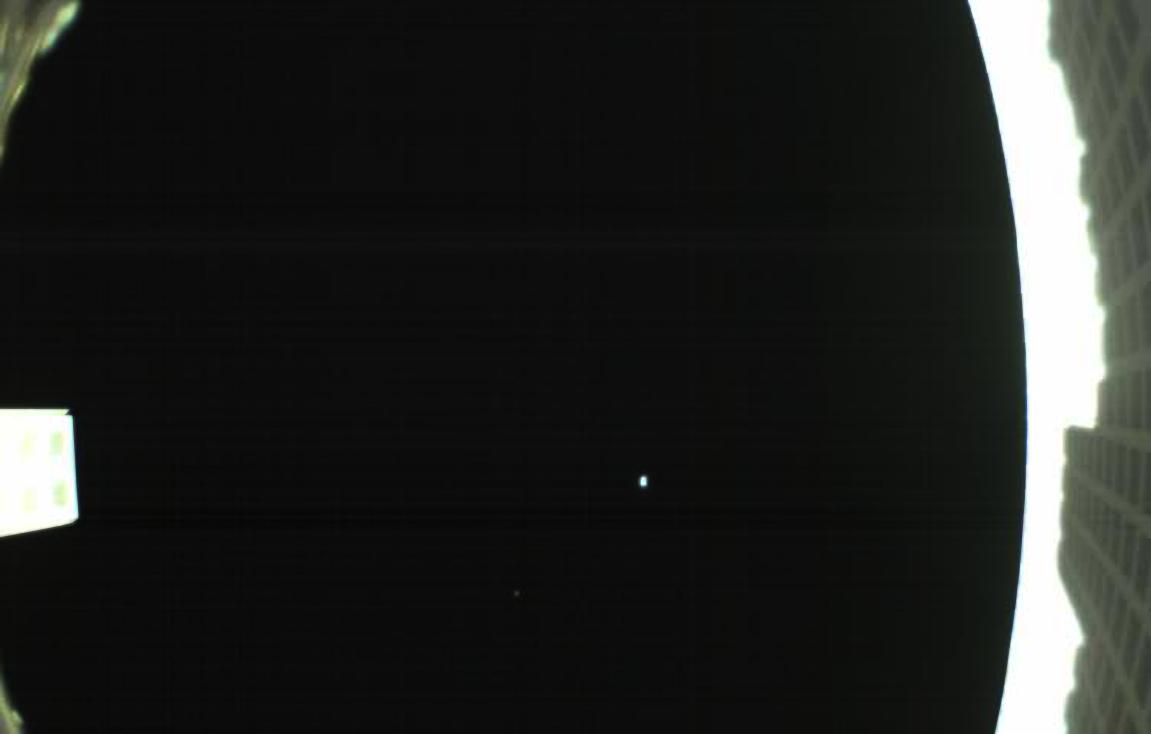 The first image captured by one of NASA's Mars Cube One (MarCO) CubeSats. The image, which shows both the CubeSat's unfolded high-gain antenna at right and the Earth and its moon in the center, was acquired by MarCO-B on May 9.