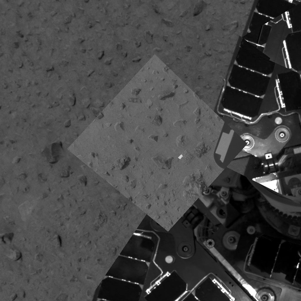 This image taken by the panoramic camera on the Mars Exploration Rover Spirit highlights the first patch of soil examined by the rover's microscopic imager. The imager is located on the rover's instrument deployment device, or "arm." The rover can be seen to the right. Engineers first deployed the arm early Friday morning, Jan. 16, 2004.