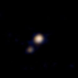 This image of Pluto and its largest moon, Charon, was taken by the Ralph color imager aboard NASA's New Horizons spacecraft on April 9 and downlinked to Earth the following day. It is the first color image ever made of the Pluto system by a spacecraft on approach. The image is a preliminary reconstruction, which will be refined later by the New Horizons science team. Clearly visible are both Pluto and the Texas-sized Charon. The image was made from a distance of about 71 million miles (115 million kilometers)-roughly the distance from the Sun to Venus. At this distance, neither Pluto nor Charon is well resolved by the color imager, but their distinctly different appearances can be seen. As New Horizons approaches its flyby of Pluto on July 14, it will deliver color images that eventually show surface features as small as a few miles across.