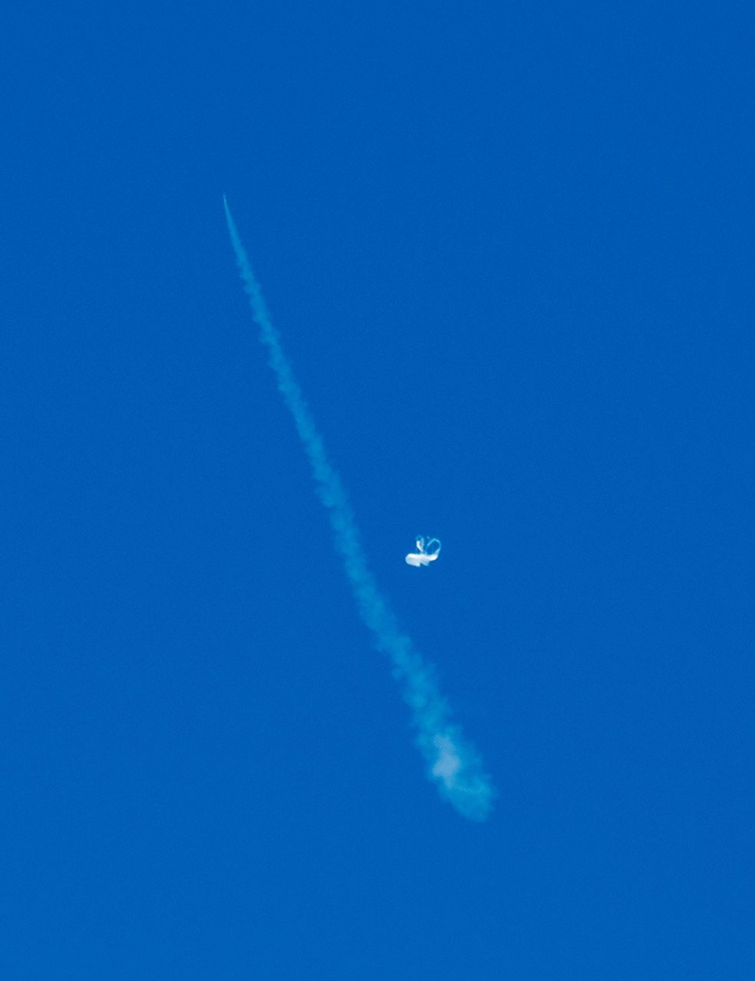 This image, taken by a member of NASA's Low-Density Supersonic Decelerator team onboard a recovery vessel, shows the initial moments of the June 28, 2014, powered flight of the saucer-shaped test vehicle. In the image, the test vehicle is unseen at the tip of the slash-like contrail at the upper left. Just to the right of the contrail, and about a third of the way up, is the balloon that carried the saucer to 120,000 feet (about 36,000 meters) above the waters of the U.S. Navy's Pacific Missile Range.