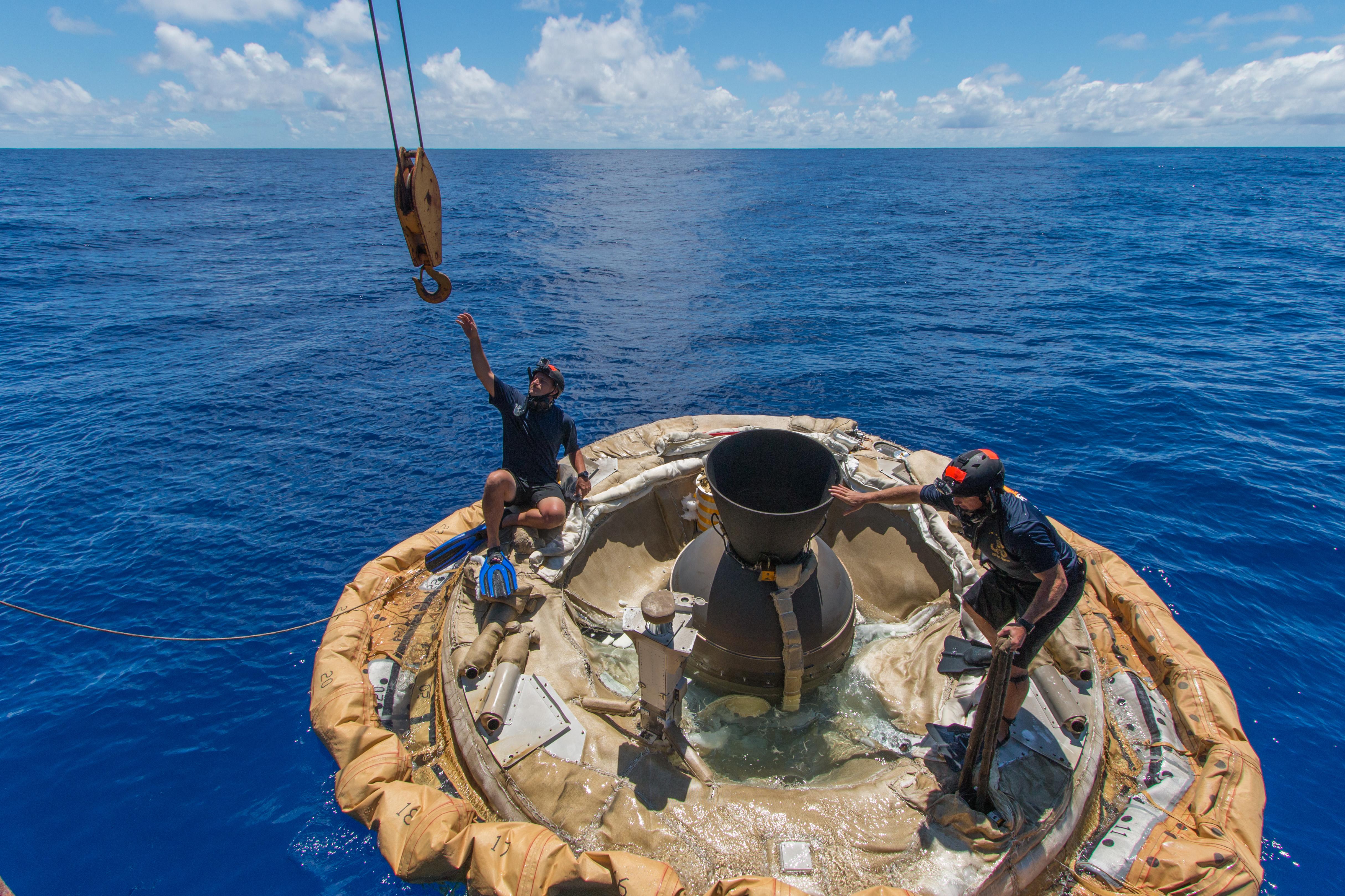 Divers retrieve the test vehicle for NASA's Low-Density Supersonic Decelerator off the coast of the U.S. Navy's Pacific Missile Range Facility in Kauai, Hawaii. On June 28, 2014, the vehicle was lifted to near-space with the help of a balloon and rocket in order to test new Mars landing technologies. The divers, from the U.S. Navy's Explosive Ordnance Disposal team, retrieved the vehicle hours after the successful test.