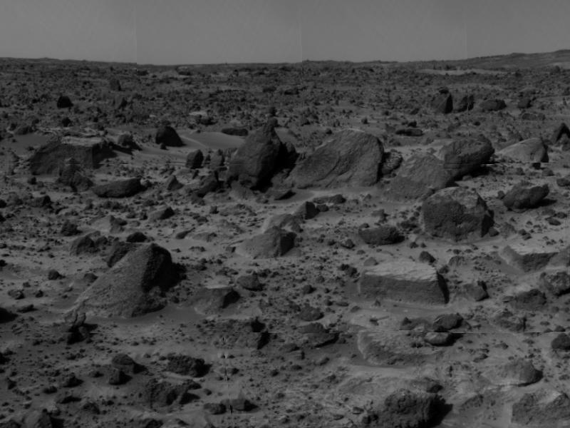 "Flat Top," the rectangular rock at lower right, is part of a stretch of rocky terrain in this image, taken by the deployed Imager for Mars Pathfinder (IMP) on Sol 3. Dust has accumulated on the top of Flat Top, but is not present on the sides due to the steep angles of the rock. This dust may have been placed by dust storms moving across the Martian surface. Flat Top has been studied using several different color filters on the IMP camera.