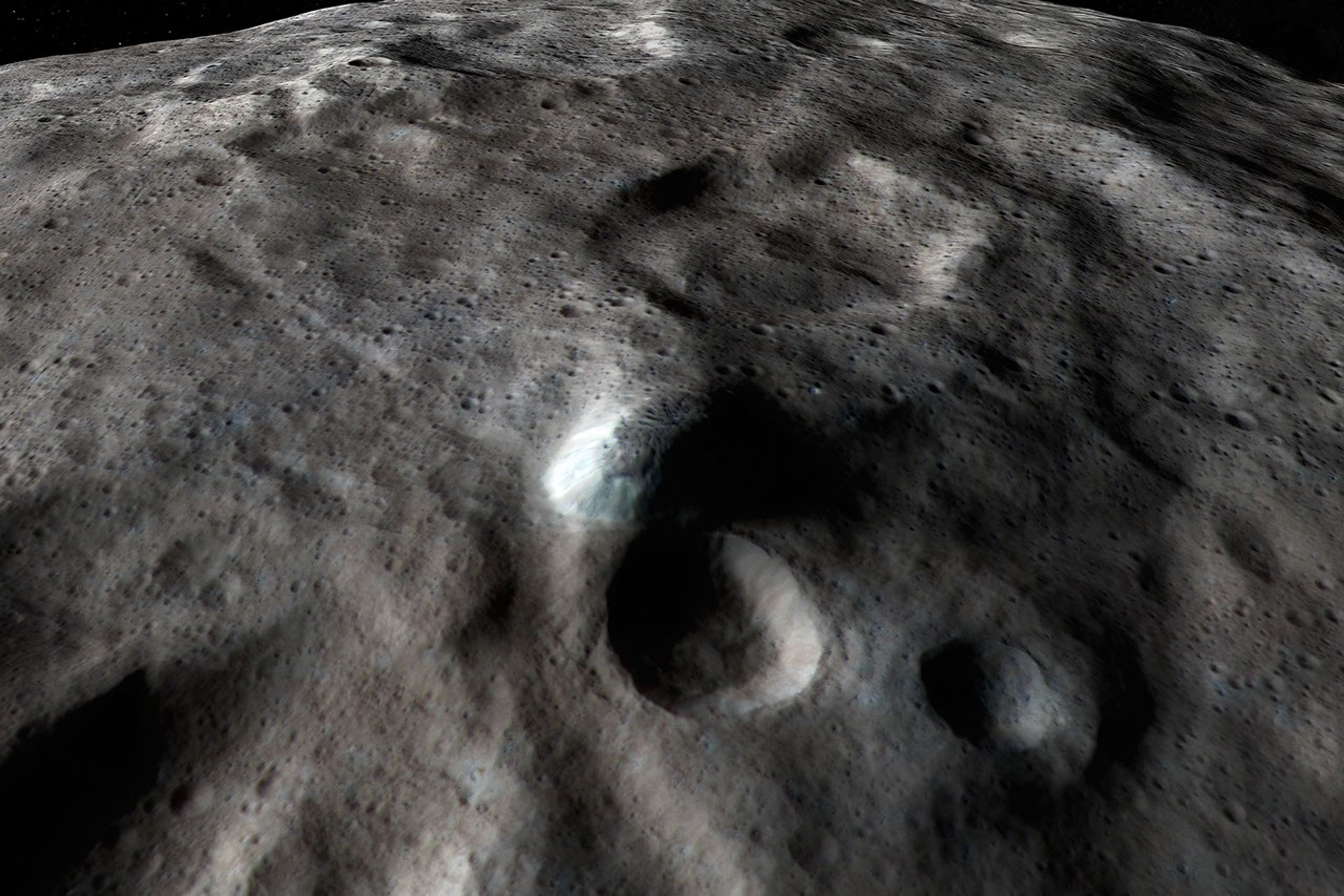 This frame is from a simulated flight of NASA's Dawn over Ceres which emphasizes the most prominent craters, as well as the mountain Ahuna Mons.