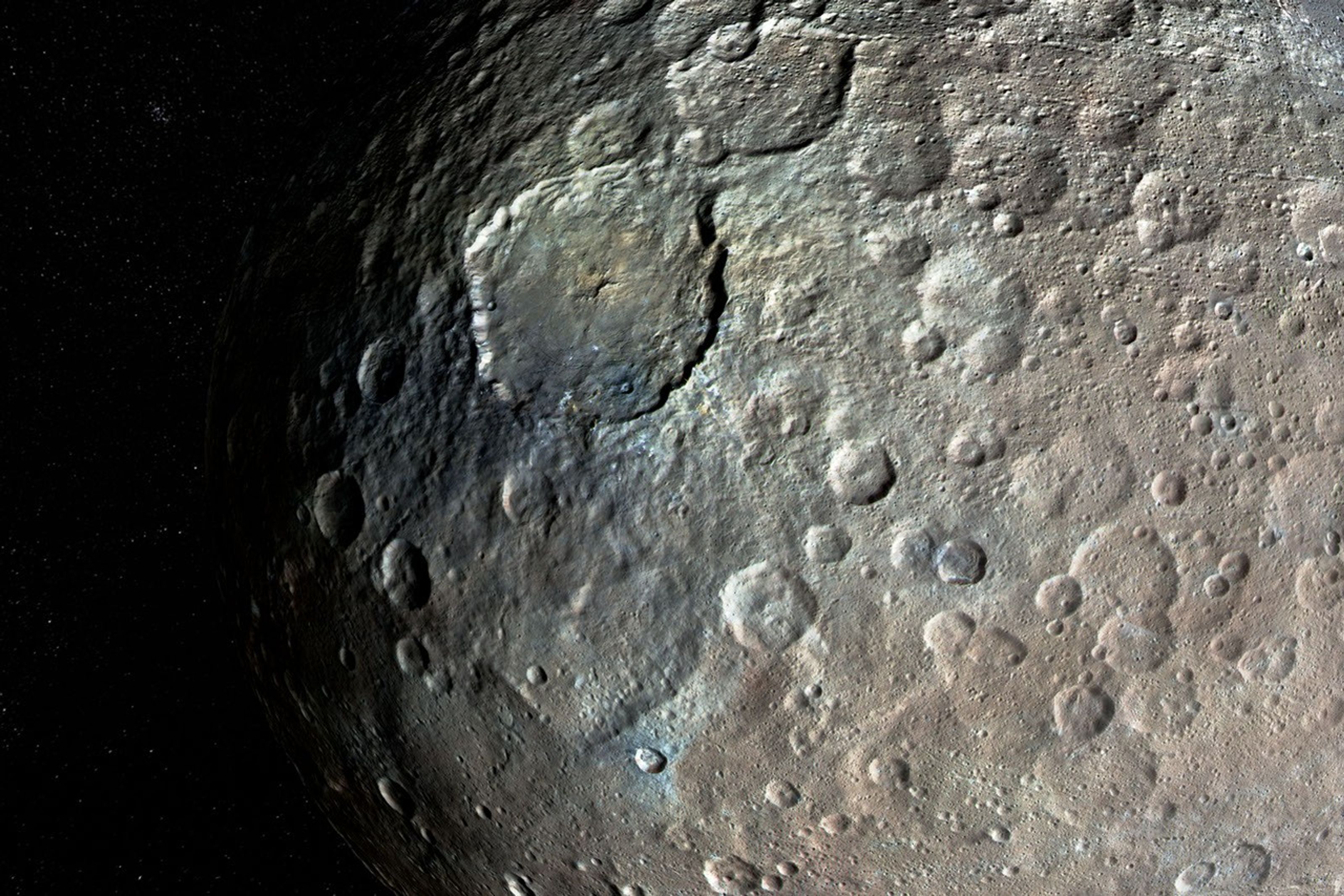 Brownish surfaces indicate a surface layer rich in phyllosilicates, which are a typical mineral found in clays. Dawn scientists think the bluish features indicate areas with younger, fresher material including flows, pits and cracks. Bright deposits mark the youngest areas on Ceres, which may contain salts.