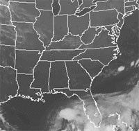 Figures 1 and 2, two images from the National Oceanic and Atmospheric Administration's Geostationary Operational Environmental Satellites show no significant weather systems over the southeastern United States on September 12 and September 28 (16 days apart). However, the microwave component of the Atmospheric Infrared Sounder Experiment on NASA's Aqua spacecraft shows a striking difference. The difference in the two microwave images (figures 3 and 4) from the AIRS Advanced Microwave Sounding Unit is primarily due to flooding after Tropical Storm Isidore. Water has a very low surface emissivity at this frequency, and that causes surface water to appear very cold (even though it is not). Land appears relatively warm (well above freezing - 273 K, even at night as seen is these images), but if there is standing water, the apparent temperature drops precipitously. Figure 4, taken just about a day after the remnants of Isidore passed over the southeast, shows heavy flooding along the Mississippi, especially in the states of Mississippi and Tennessee, but other states are also affected. The spatial resolution of the AMSU-A instrument is relatively large (each measurement spot is about 25 miles in diameter at the center of the swath), but the enormous thermal contrast in the microwave between land and water makes even small flooded areas stand out.