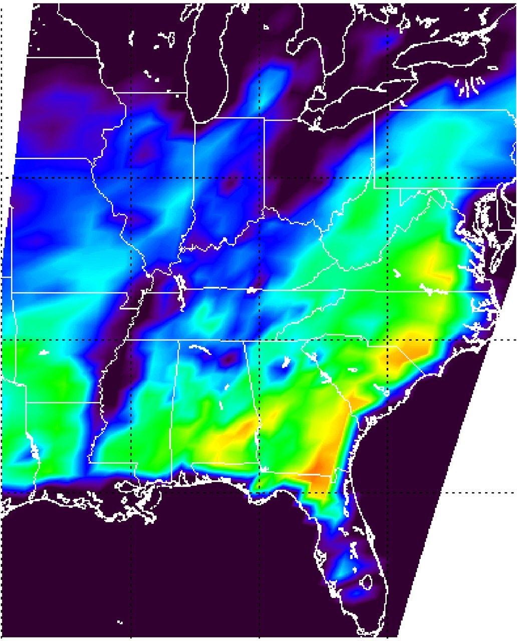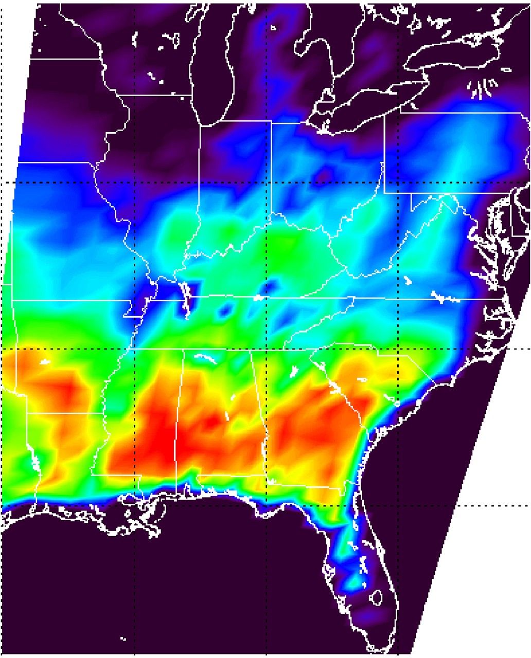 The Aqua spacecraft has an exact 16-day repeat cycle, that is why the pre-Isidore image is 16 days prior to the post-Isidore image. They have exactly the same coverage, which makes it possible to obtain a difference image (figure 5). The difference image is the difference between the September 28 and September 12 images shown. In the difference image, white indicates no difference at all, green is very little difference, blue/purple indicates primarily heavy flooding. Red indicates warming likely due to warmer weather. (The straight lines on the right and left edges of the difference image are caused by slight differences between the two repeat passes of Aqua).