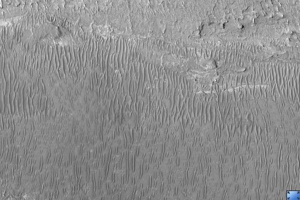 This HiRISE image (PSP_002538_1720) shows the floor of Ius Chasma. The floor is bounded to the north and south by higher standing wallrock, with a few exposures of wallrock seen in the north (top) of the picture. Much of the floor is covered by ripples that are oriented approximately north-south, indicating an east to west wind flow, parallel to the orientation of Ius Chasma.