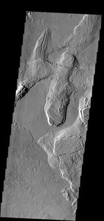 In this part of the Tharsis region, old lava flows have been fractured. Younger lava flows are unfractured (flow at bottom).