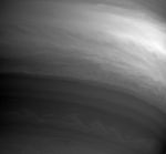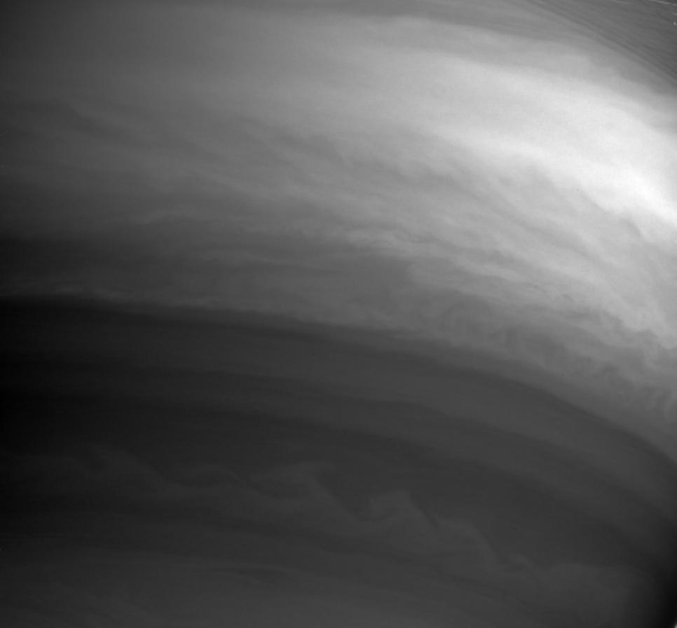 This Cassini image shows details in the swirling clouds of Saturn's southern hemisphere. Although the contrast between light and dark is low, the clouds exhibit considerable structure. At larger scales the east-west banded flow pattern of the atmosphere dominates. At small scales turbulent eddies and waves predominate.