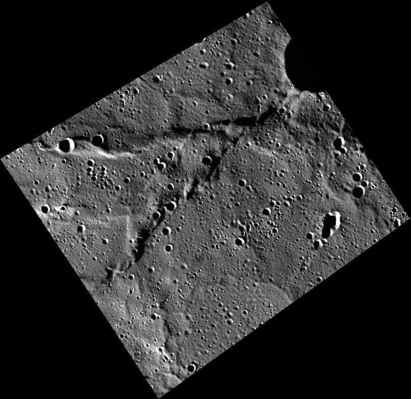 This view of a location within Mercury's northern volcanic plains includes a set of wrinkle ridges that form a "V" shape.