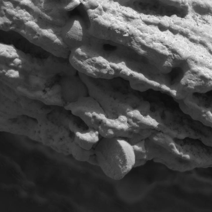 This image, taken by the microscopic imager on the Mars Exploration Rover Opportunity, shows a geological feature dubbed "Robert E." Light from the top is illuminating the feature, which is located within the rock outcrop at Meridiani Planum, Mars. Several images, each showing a different part of "Robert E" in good focus, were merged to produce this view. The area in this image, taken on Sol 15 of the Opportunity mission, is 2.2 centimeters (0.8 inches) across.