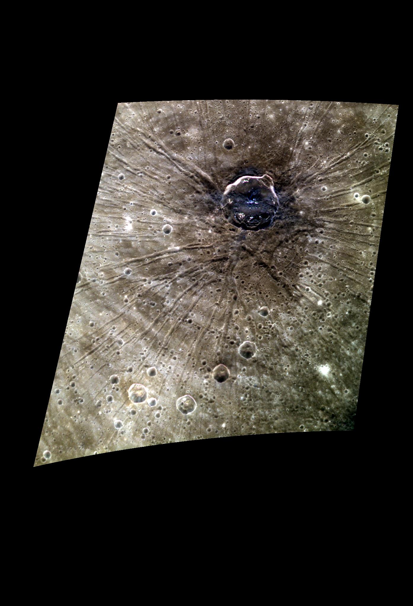 The crater Apollodorus has received quite a bit of attention from scientists because it sits within the Caloris Basin and on top of the prominent Pantheon Fossae. This image is particularly interesting because it shows the variations in composition as a result of the impact. The dark blue material in Apollodorus was excavated from depth as the crater formed.