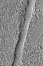 This Mars Global Surveyor (MGS) Mars Orbiter Camera (MOC) image shows a wind ripple-filled trough, a fracture in a rugged and pitted plain, located northwest of Kasei Valles in the Nilus Chaos region.