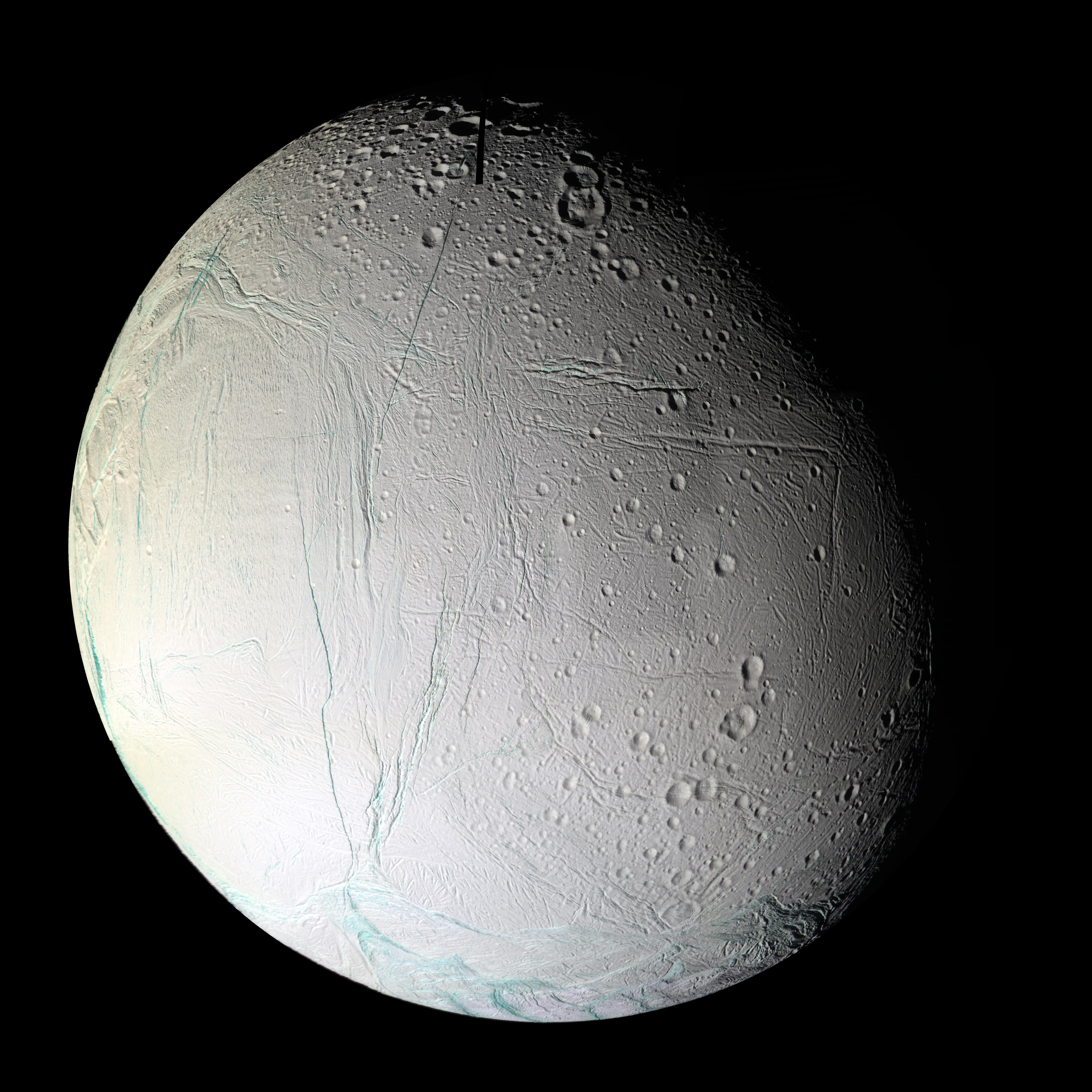 The mosaic shows the anti-Saturnian hemisphere of Enceladus -- the side that always faces away from Saturn. This region contains a number of tectonic and impact features and shows how these two geologic forces interact on Enceladus. The center left portion of this mosaic is dominated by Diyar Planitia. Like Sarandib Planitia observed in the previous Enceladus flyby, the region is characterized by low ridges and troughs. Throughout this hemisphere, fractures of all sizes disrupt the previously existing cratered terrain and even the comparatively youthful Diyar Planitia.