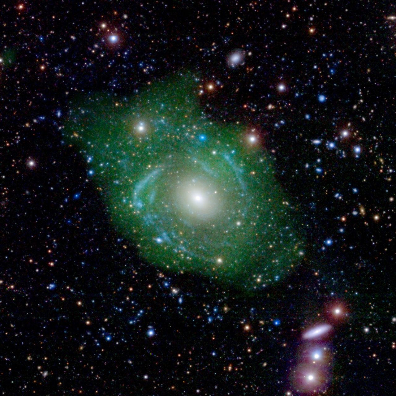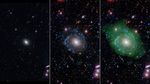 In the image at left, UGC 1382 appears to be a simple elliptical galaxy, based on optical data from the Sloan Digital Sky Survey (SDSS). But spiral arms emerged when astronomers incorporated ultraviolet data from the Galaxy Evolution Explorer (GALEX) and deep optical data from SDSS, as seen in the middle image. Combining that with a view of low-density hydrogen gas (shown in green), detected at radio wavelengths by the Very Large Array, scientists discovered that UGC 1382 is a giant, and one of the largest isolated galaxies known.