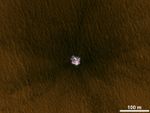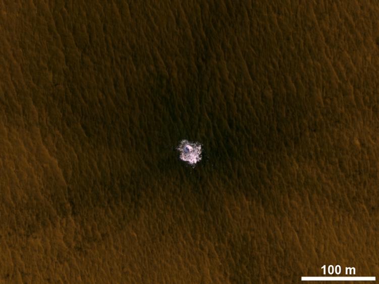 A meteorite impact that excavated this crater on Mars exposed bright ice that had been hidden just beneath the surface at this location: latitude 43.9 degrees north, longitude 204.3 degrees east. The 100-meter scale bar at lower right is 109 yards.