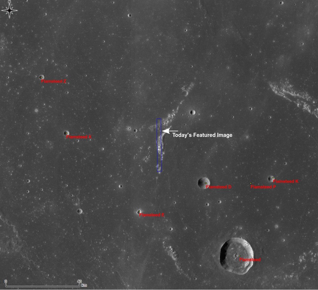 | Context view of today's Featured Image. Blue box indicates the NAC frame, and white arrow points out the location of the two craters. Image center is 2.47° S, 314.26° E. LROC WAC mosaic, 100 m/pixel |